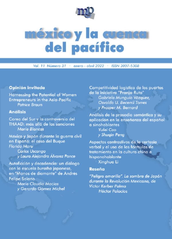 Vol. 11 Núm. 32 (2022)México y la Cuenca del Pacífico (MyCP) es una revista académica que tiene por objeto contribuir a la investigación, desde una perspectiva multidisciplinaria, de la sociedad, la cultura, el medio ambiente, la economía y la política de las economías de Asia-Pacífico así como de los procesos de integración regional. Es una revista cuatrimestral, pionera en su género en México y América Latina. De acceso libre y publicada en formato digital e impreso, MyCP se distingue como un foro de discusión científica, dirigido a investigadores y estudiantes interesados en las relaciones transpacíficas. La calidad de los artículos publicados, originales e inéditos, está respaldada por un estricto proceso de arbitraje a doble ciego y por pares de reconocida calidad académica. MyCP es editada por la Universidad de Guadalajara sin cargos por el envío y el procesamiento de los artículos que se reciben tanto en español como en inglés. MyCP se apega a los lineamientos del Comité de Ética para Publicaciones (COPE). -